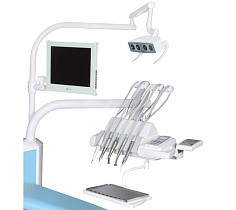 • модуль оборудован сенсорным ЖК-дисплеем, управляющим работой инструментов, кресла, светильника. блоком управления установкой: вкл./выкл. установки, вкл./выкл. светильника (интенсивность освещения), вкл./выкл. подогрева воды в бойлере, смыв гигиенической раковины, наполнение стакана, положение для полоскания, кнопка возврата в нулевое положение