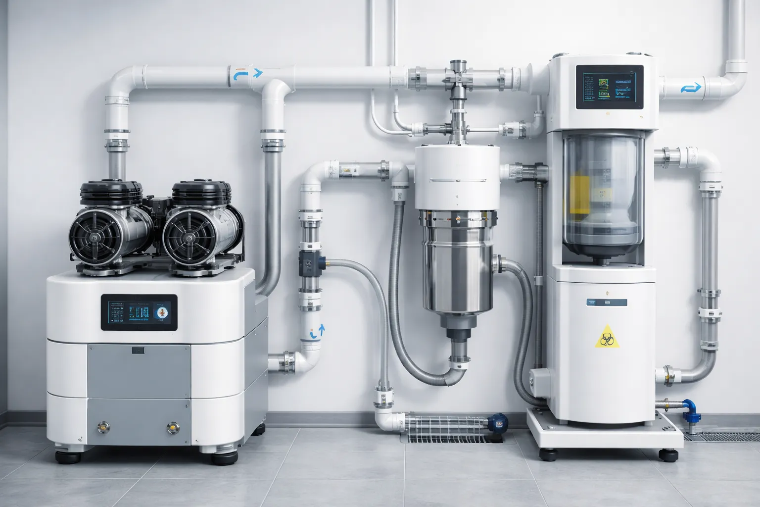 Вакуумные системы интегрируются с компрессорным оборудованием, стоматологическими установками и централизованными инженерными решениями, формируя единую экосистему жизнеобеспечения клиники. Они также дополняют системы вентиляции и очистки воздуха, повышая общий уровень гигиены и безопасности в помещении.